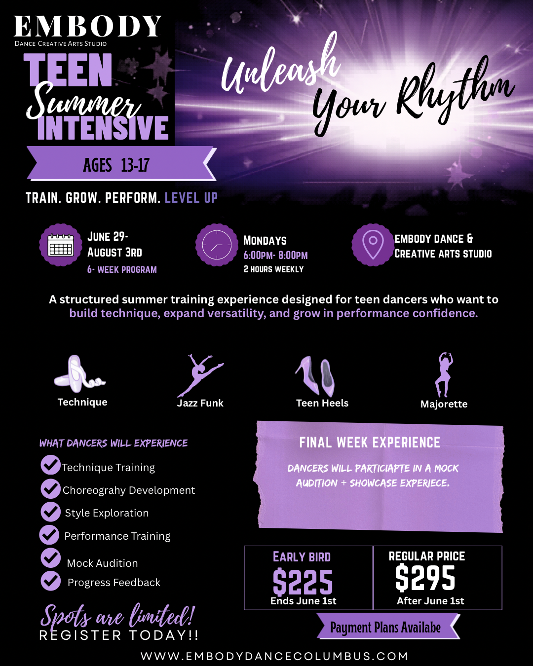 Our Embody Teen Summer Intensive is a 6-week training experience designed for dancers who want more than just a class. This is about growth, discipline, and performance!