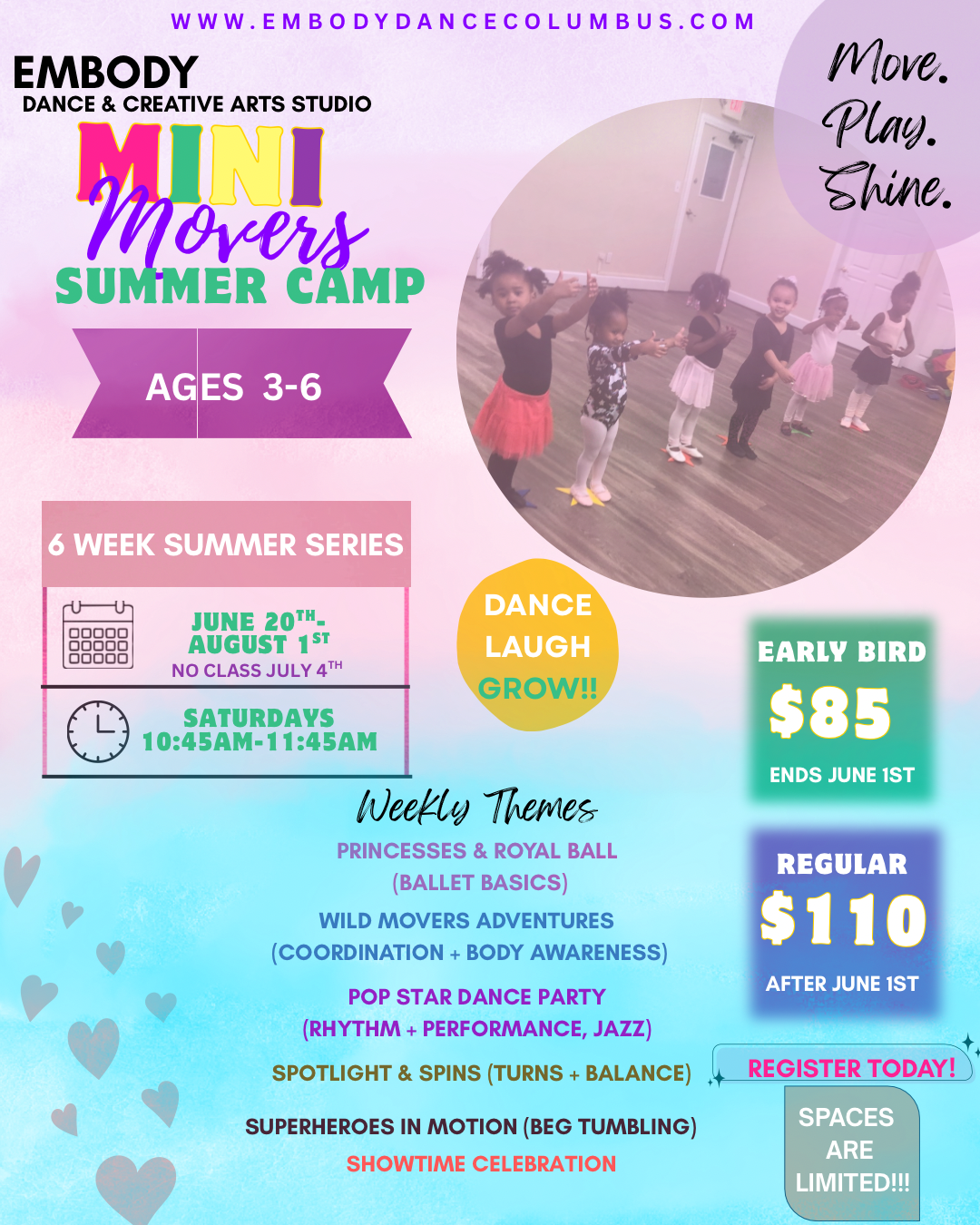 Join us here at Embody for a fun and upbeat 6 Week Summer Series where young dancers ages 3-6 build confidence, coordination, and creativity in a supportive and engaging environment.